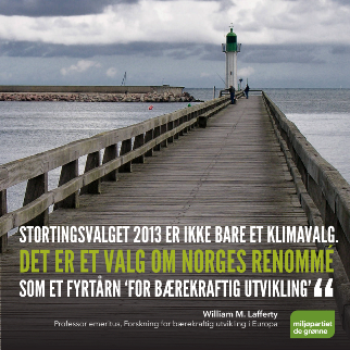 «Vårt overordnede krav for å kunne støtte en regjering, er at Norge må starte et nasjonalt prosjekt for omlegging til et bærekraftig samfunn – og at dette må settes i gang nå. Norges økonomiske handlingsrom, kombinert med omstillingsevnen til norsk næringsliv, kan gjøre Norge til en ledende kunnskaps- og velferdsstat også etter oljealderen. Dette forutsetter at vi ikke venter til vi blir tvunget til det, men starter omstillingen i dag.» (Hanna Marcussen og Harald Nissen, nasjonale talspersoner for Miljøpartiet De Grønne).